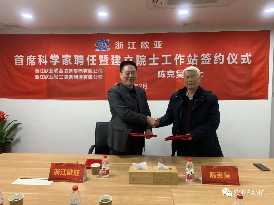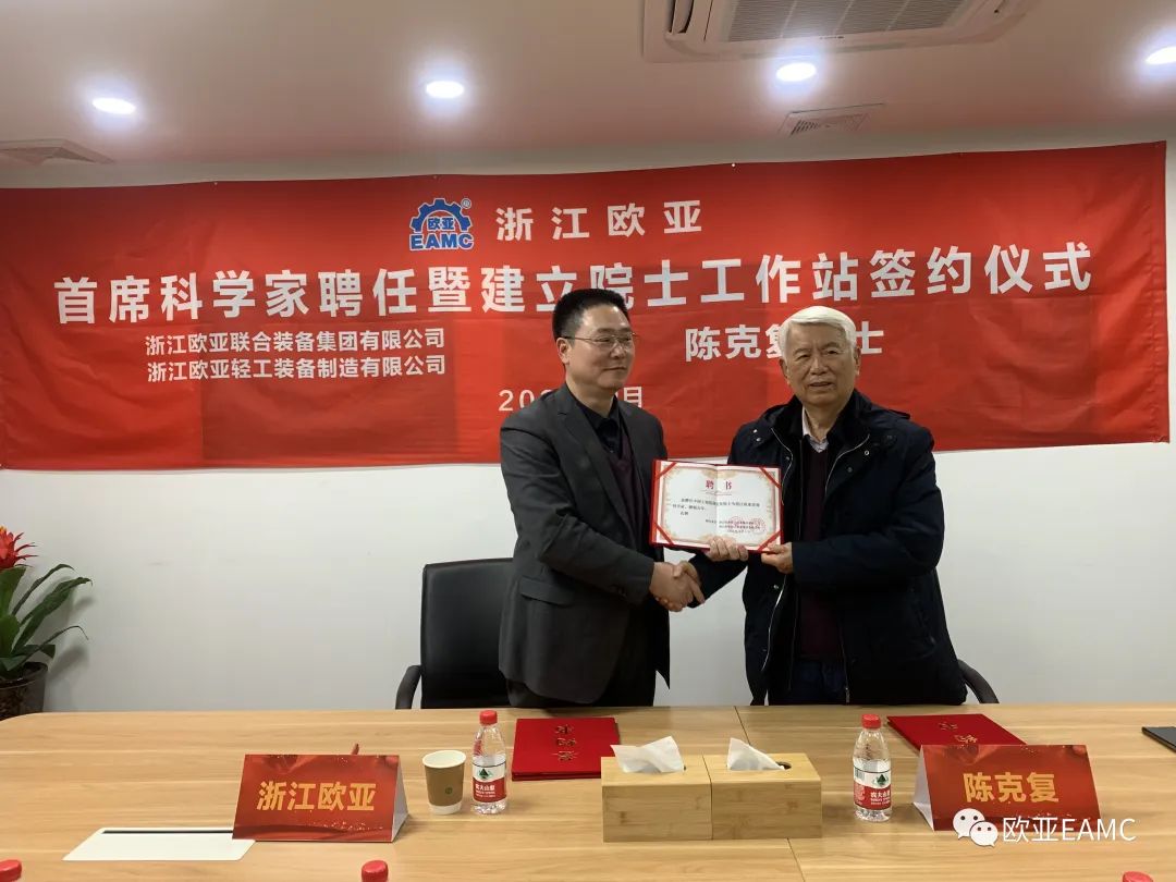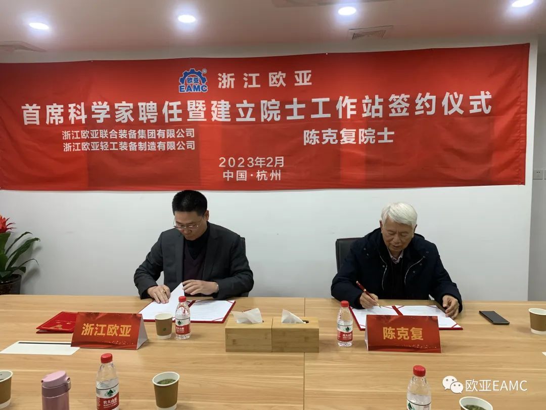 2023年2月23日,浙江歐亞聯(lián)合裝備集團有限公司在杭州隆重舉行首席科學(xué)家聘任暨建立院士工作站簽約儀式,聘任中國工程院院士陳克復(fù)為歐亞首席科學(xué)家,并簽訂院士工作站建立框架合作協(xié)議。